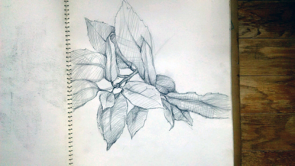 芸大本部の前に築山があり、彰義隊がそこで自決したと言われる古木の周りに、青木が生え茂っていた。私はその藪の中に座り込んで、毎日毎日、青木をスケッチした。
