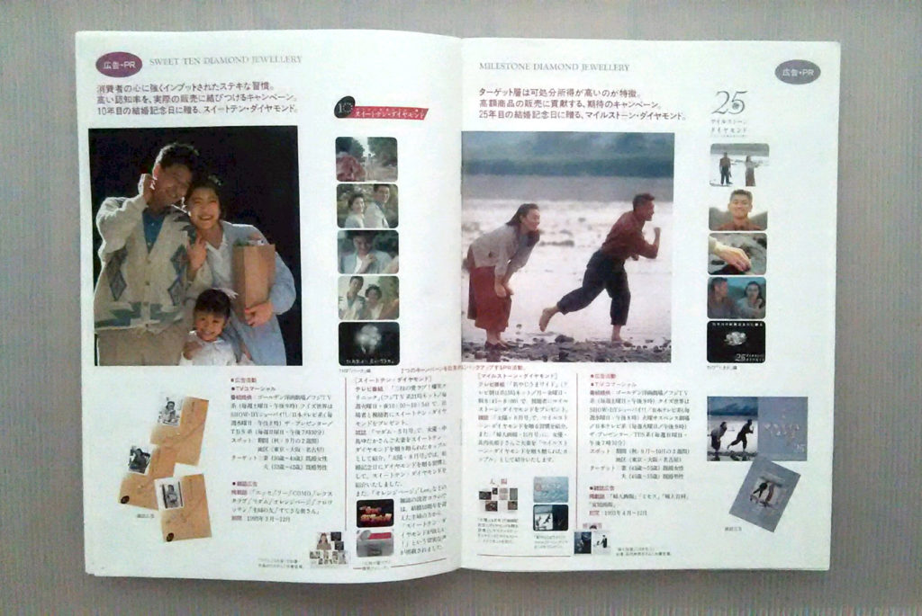 夫婦の愛の証としては、第一子の誕生の感謝を込めて、夫から妻へ贈る「エタニティリング」を。結婚10年の記念日は「スイートテン・ダイヤモンド」。結婚25周年は「25th アニバーサリー」として、さらに大きな1カラットのダイヤモンドを。と、キャンペーンを展開させた。
