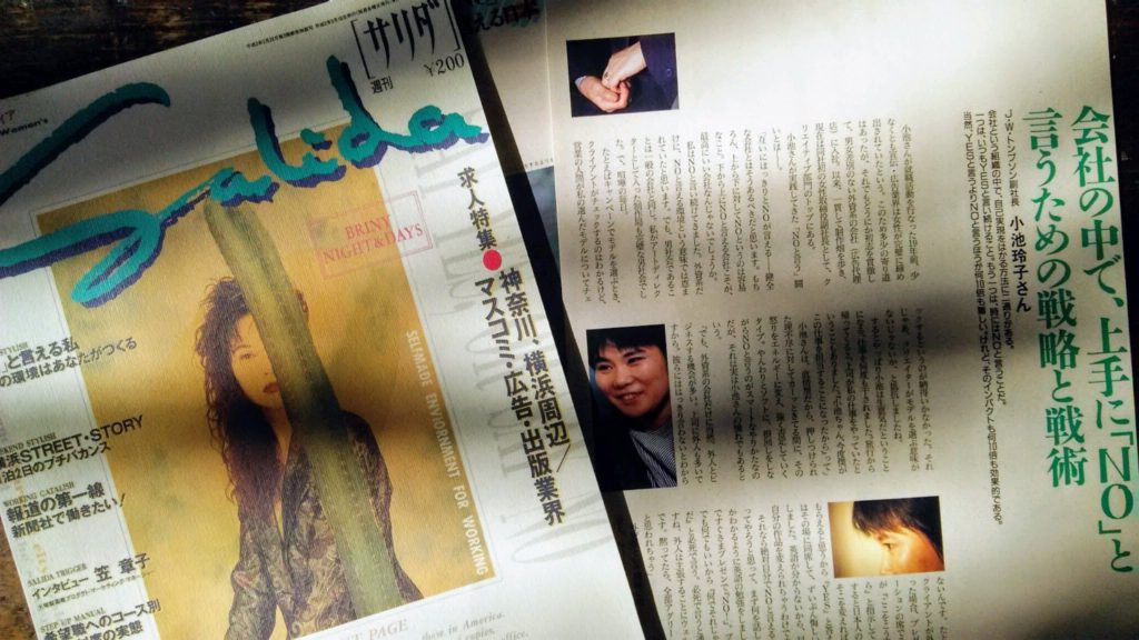 サリダ:1985年に男女雇用機会均等法が制定された。女性の社会進出が可能となり、それに従って女性の職場における様々な問題について、女性誌が特集を組むことも多かった。職場でいかにNOを言うかについてのインタビュー。