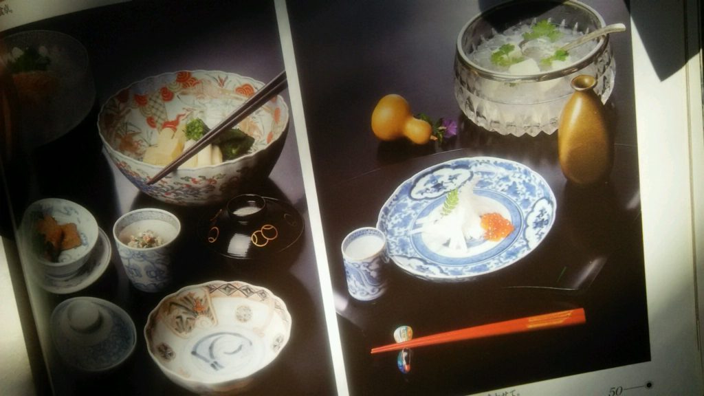 ▲ちょっと高級な古伊万里を使った食卓。こんな贅沢ではないが一般の家庭でも、陶器やガラス、漆など、