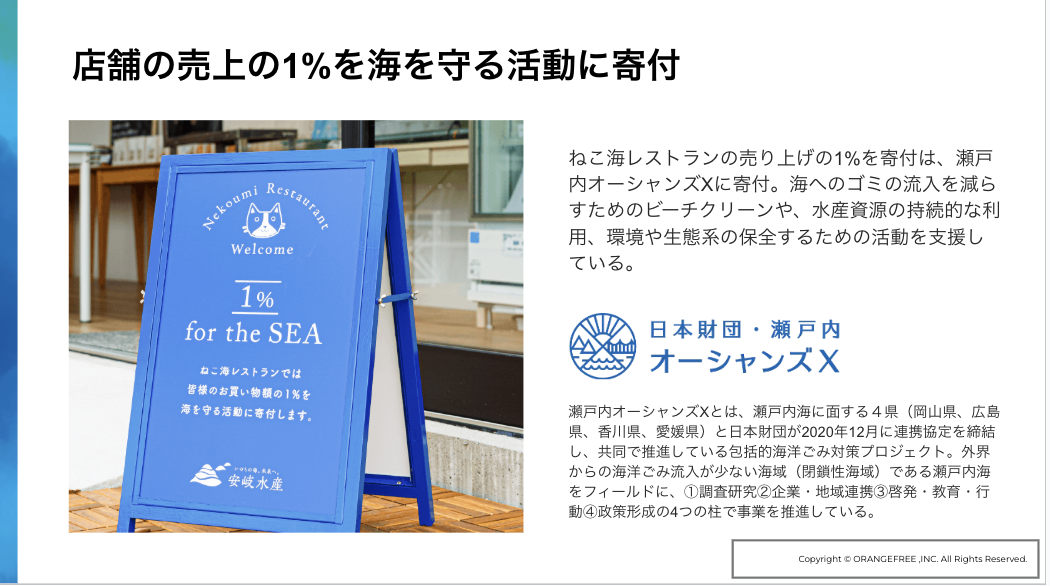 オレンジフリーさんにつくっていただいた「ねこ海レストラン」の世界観は、 いまや社内外に浸透し、愛らしいキャラクター“ちゅみ”が会社と地域をつなぐシンボルになっています。 社員はちゅみのことが大好きで、イベントではTシャツを着て一体感を楽しんでいます。 ブランドは可視化することで皆んなの心が一つになり、地域との絆も深まるんですね。 これからも企業主導型の地域ブランディングで、この町に貢献していきたいと思います。