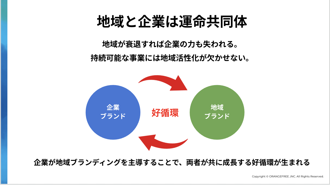 地域と地元企業は運命共同体です。地域が衰退すれば、企業の活力も失われます。持続可能な事業のためには、地域の活性化は避けて通れない重要課題です。企業ブランドが地域を照らし、地域ブランドが企業を押し上げる──この相関関係をブランディングでつくることをご提案しました。